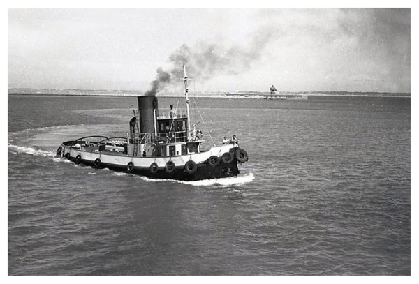 Auxiliando al buque Ciudad de Cádiz (2º) en maniobra de salida del puerto de Cádiz circa 1953.