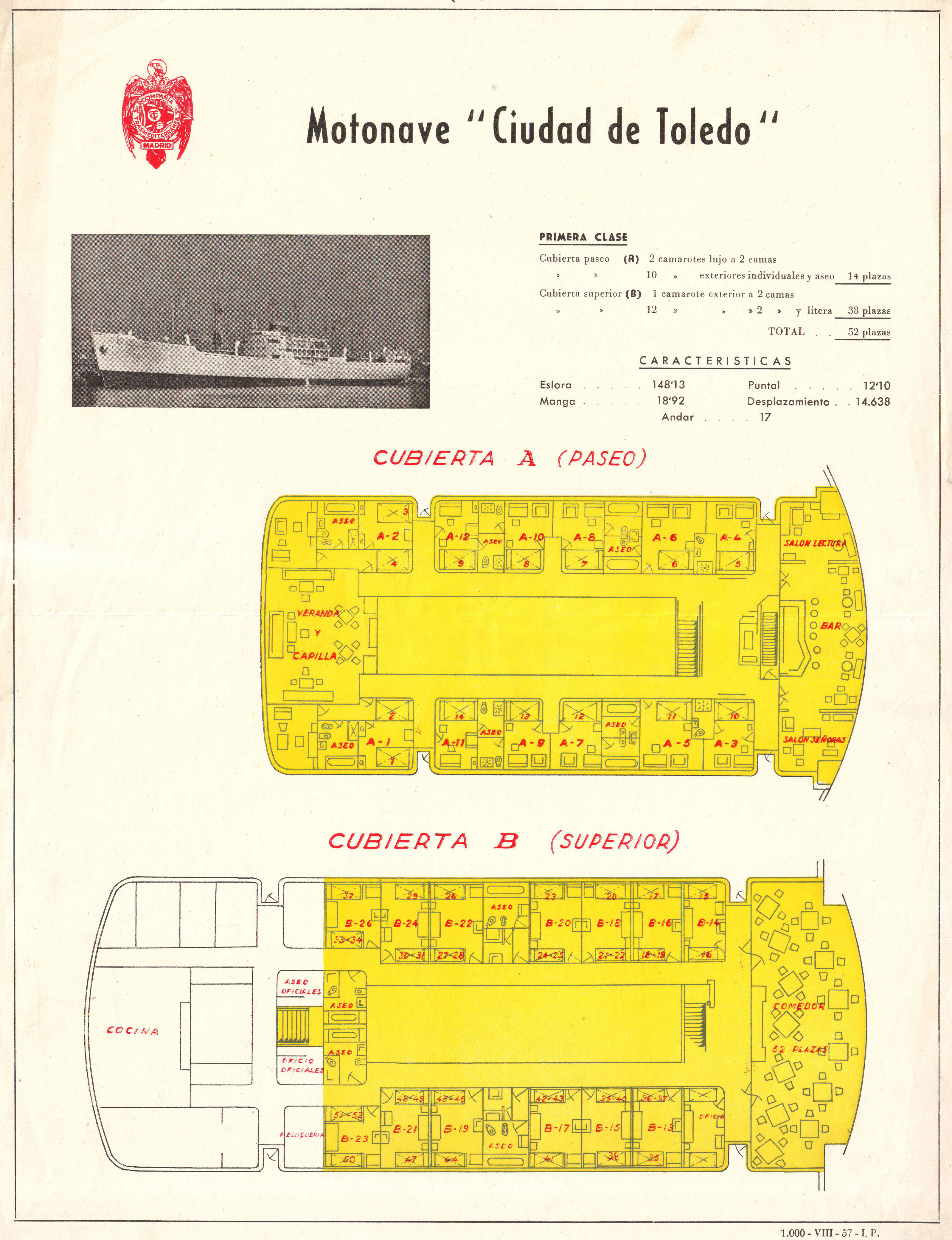 Pauta de acomodación del buque Ciudad de Toledo vigente en agosto de 1957.