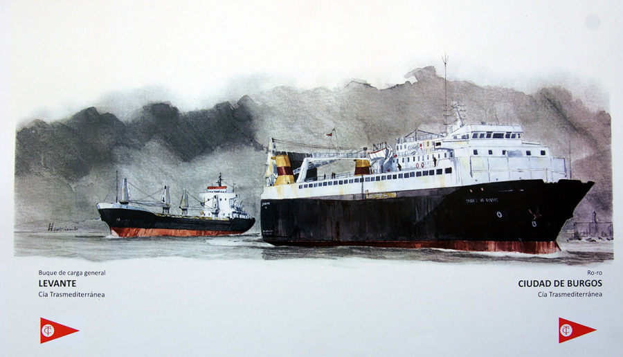 Preciosa acuarela que muestra al multiporpose Levante a la popa del Rolon Ciudad de Burgos (2º).