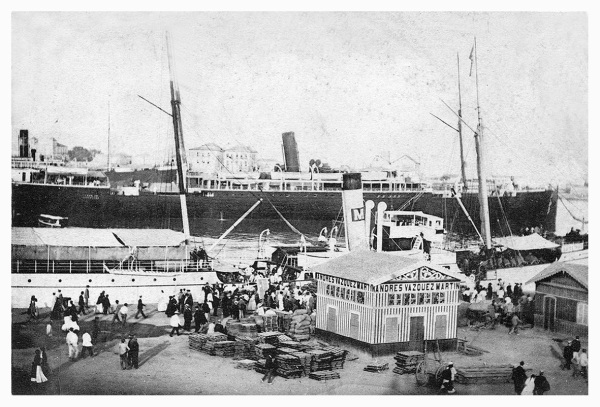 Atracado en el muelle de Cánovas del puerto de Málaga en 1909, desembarcando heridos procedentes de Melilla.