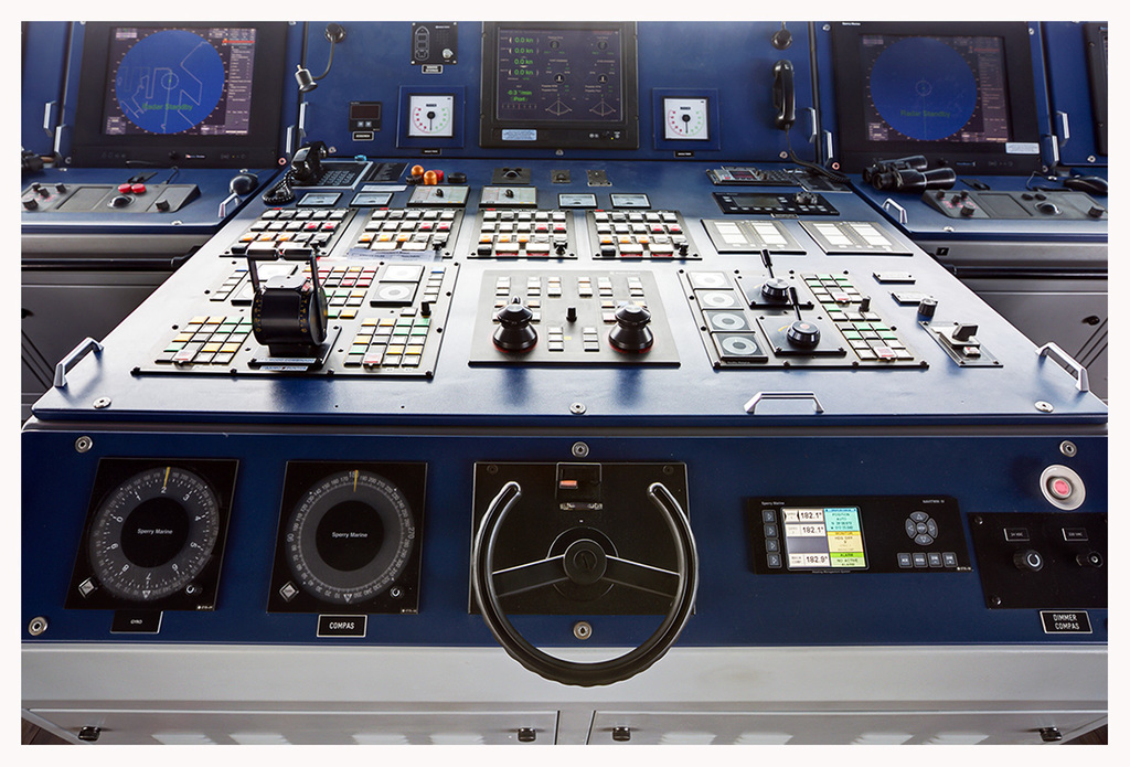 El equipo de gobierno y maniobra está compuesto por dos servomotores electrohidráulicos del tipo rotativo, dos timones semicompensados de tipo articulado y dos hélices transversales de paso controlable de 1.000 kW, en la zona de proa.