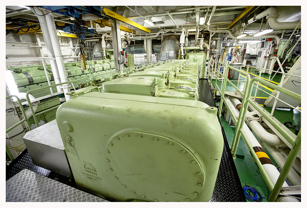 Cuatro motores diésel MAN, tipo 9L48/60B, de cuatro tiempos, simple acción, 9 cilindros de 480 mm de diámetro por 600 mm de carrera acoplados, dos a dos, mediante acoplamiento flexible, a un reductor y su correspondiente eje de cola.