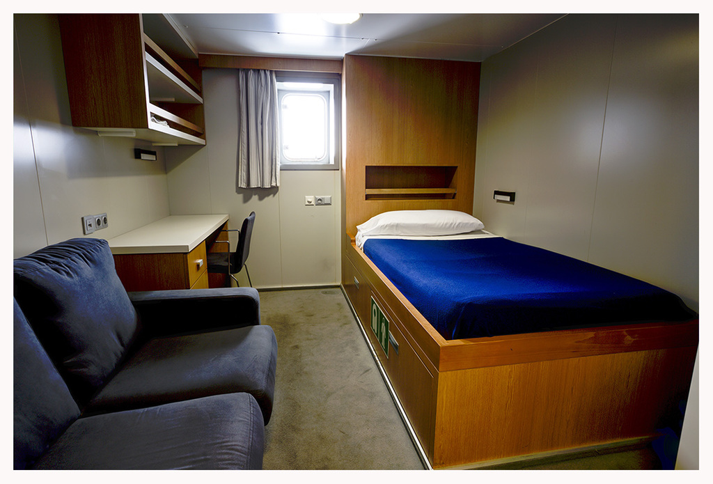 Para la tripulación el buque posee 28 camarotes individuales entre los que se incluye un camarote de armador, dos de alumnos y tres de reserva. También posee 6 camarotes dobles que pueden ser destinados tanto a tripulación como a los pasajeros.