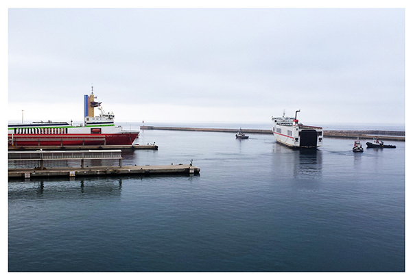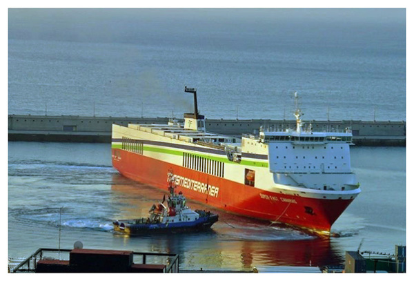 El Super-Fast Andalucia, a remolque del remolcador Brucoli, abandona el puerto de Almería el 13